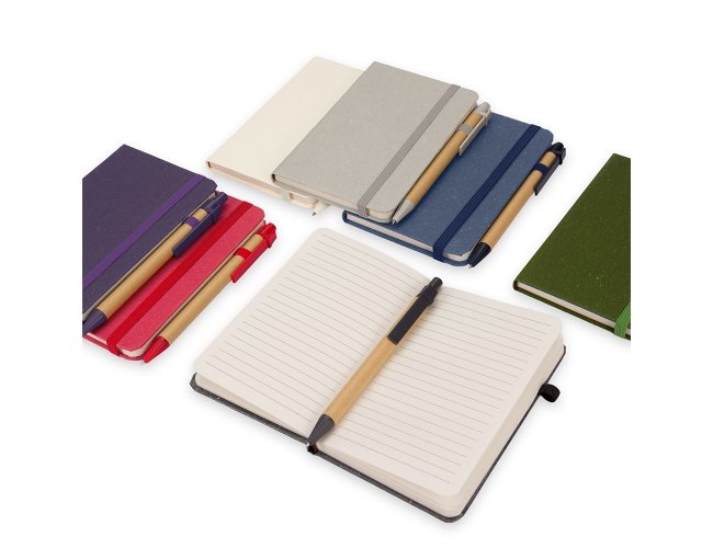 Descrição: Caderneta ecológica de capa dura revestida em fibra de palha de trigo. Contém aproximadamente 80 folhas brancas com pauta, além de duas folhas de guarda, uma fita para fechamento e porta-canetas elástico. Acompanha uma caneta esferográfica de carga azul de 1,0mm com corpo em papelão e clip, acionamento por clique e ponteira em plástico.