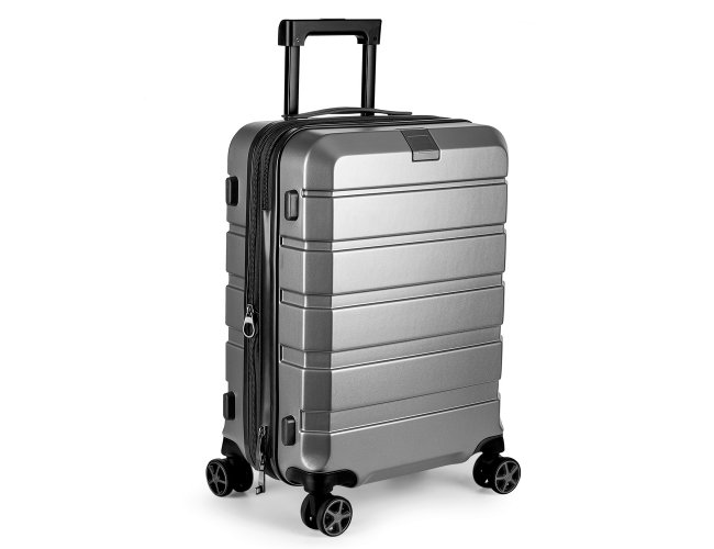 Mala de viagem executivo em ABS com interior forrado, com divisória. Fecho de segurança com senha na lateral, 4 rodas giratórias, pega extensível em alumínio, com mola (altura da pega estendida até 500 mm), e placa metálica removível com imã, para fácil gravação. Mala com capacidade até 31 L e peso de 2,25 kg. 355 x 550 x 200 mm