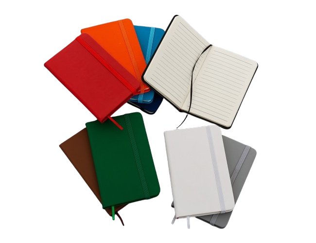 Caderneta em material kraft, frente e verso liso com fita elástica para fechar. Contém aproximadamente 70 folhas brancas